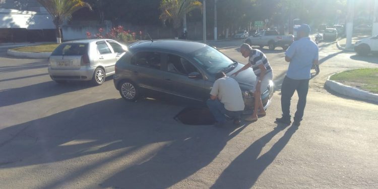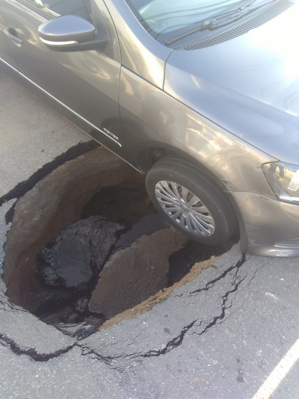 Uma cratera engoliu parte de um veículo na tarde desta terça-feira (3.05), em uma rotatória próxima à rodoviária. Ninguém se feriu, somente danos materiais leves.