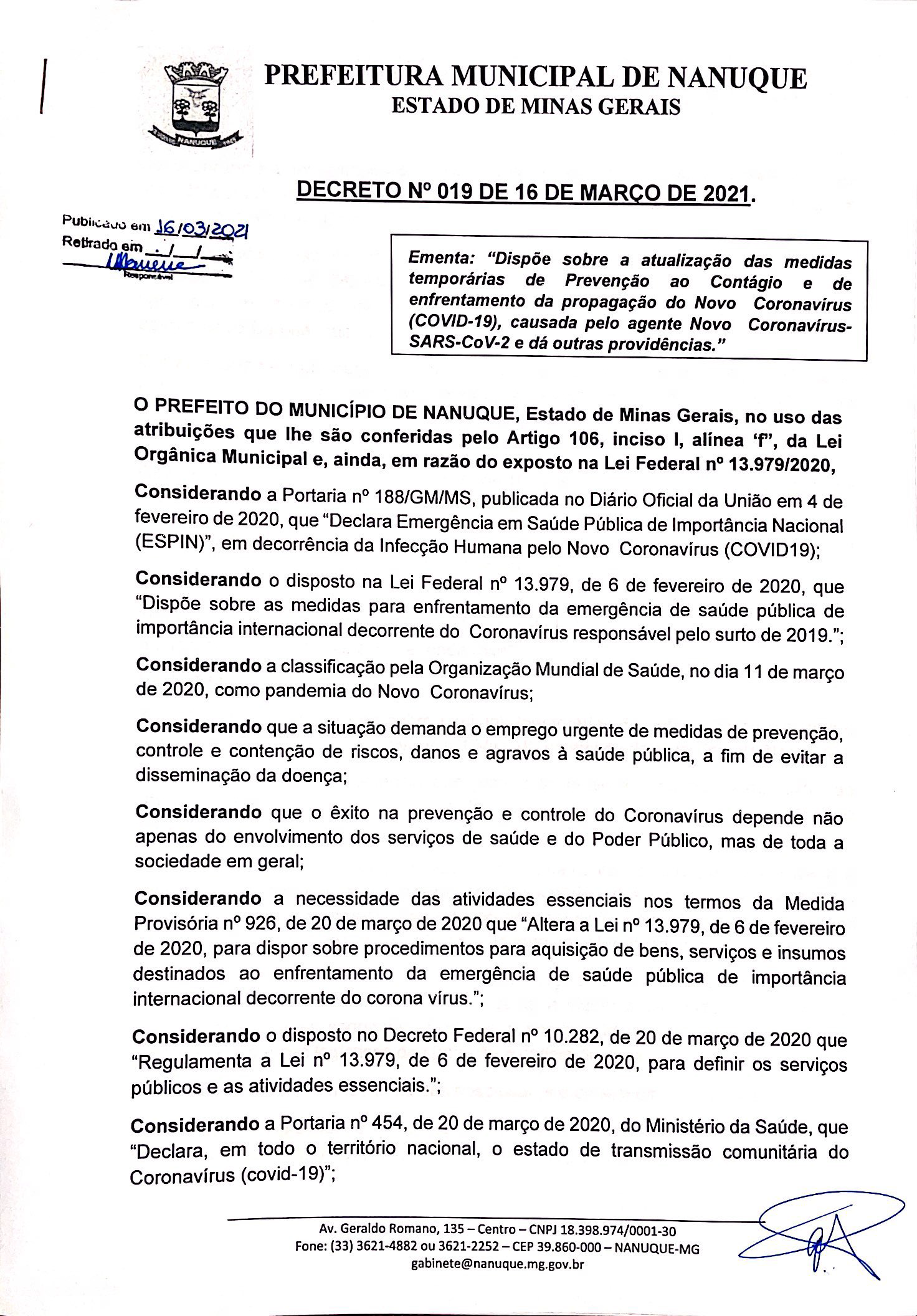 Confira abaixo o Decreto 019/2021