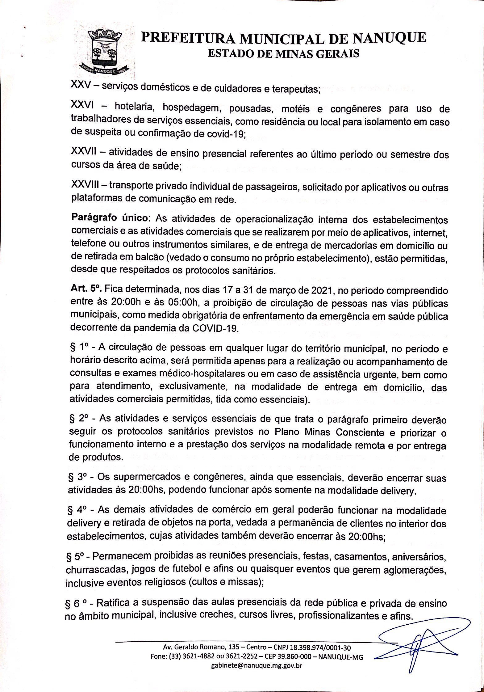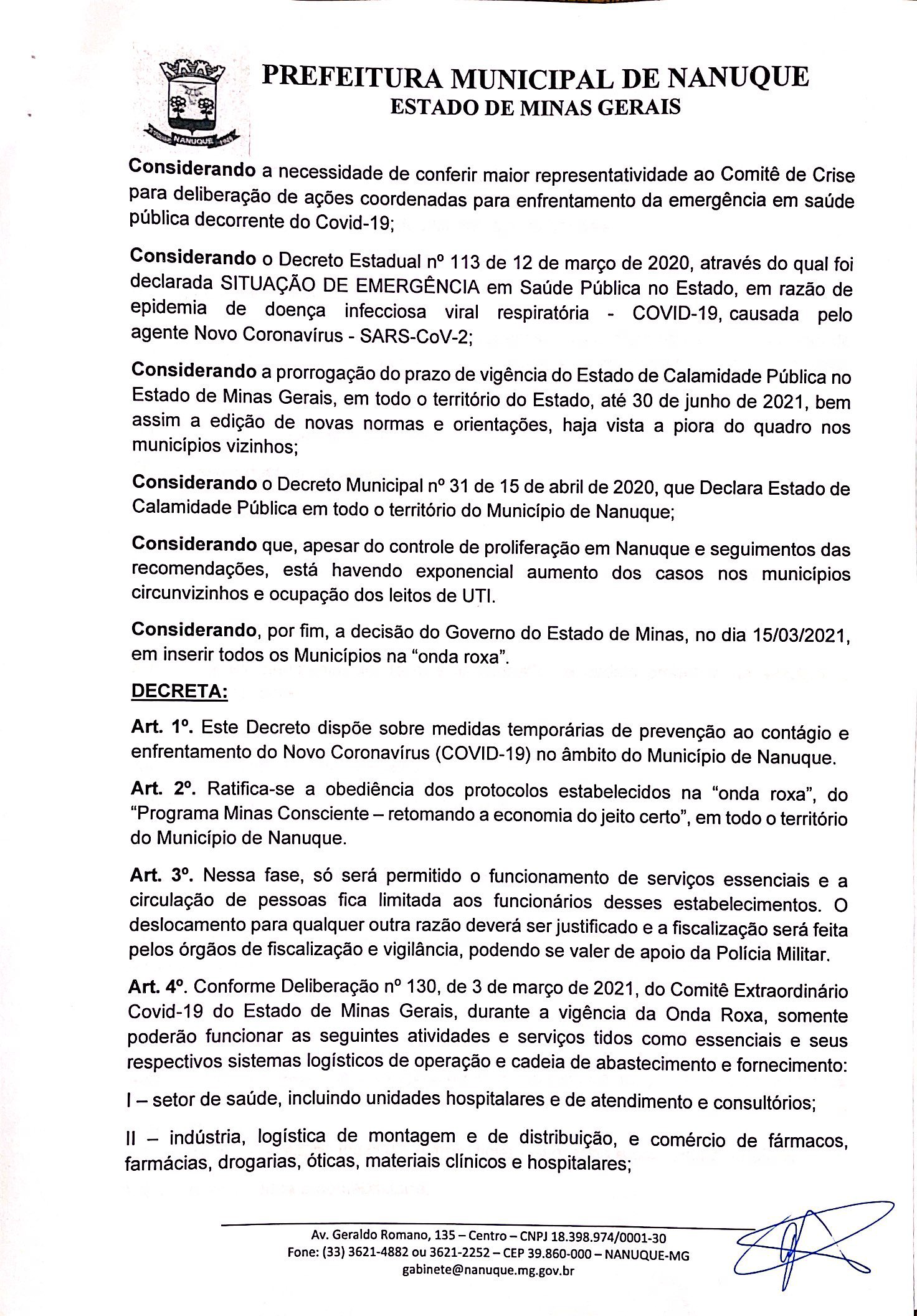 Em Nanuque, o Prefeito Gilson Coleta publicou Decreto onde ratifica todas as medidas restritivas impostas pela onda roxa, restringindo a circulação de pessoas com o funcionamento apenas dos serviços considerados essenciais e toque de recolher com proibição expressa de circulação de pessoas no horário compreendido entre as 20h e 05h da manhã.